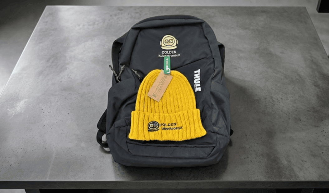 - Golden Kubestronaut logolu özel sırt çantası ve bere