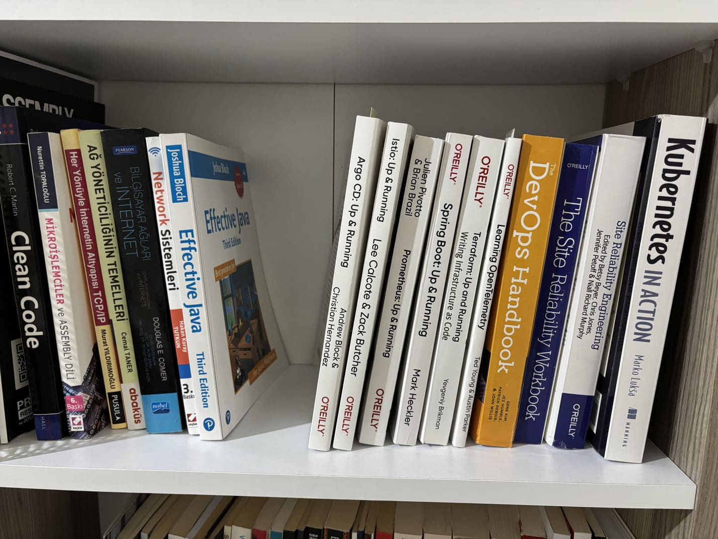 Hazırlık sürecimde okuduğum tüm kitapları buraya koyuyorum. Kitaplığımdaki en güzel rafının fotoğrafı aşağıda. Fakat fiziksel kitapları edinmeniz zor ise O'Reilly sitesinden dijital baskılarını okuyabilirsiniz.